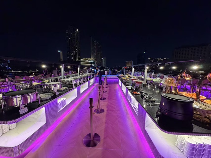 20.15 น. เรือออกจากท่าไอคอนสยาม เชิญท่านอิ่มอร่อยกับอาหารแบบบุฟเฟต์นานาชาติรสเลิศโดยเชฟฝีมือเยี่ยม เคล้าคลอด้วยเสียงเพลงอันไพเราะ จากวงดนตรีบรรเลงขับกล่อมระหว่างรับประทานอาหาร และสนุกสนานเพลิดเพลินกับการแสดง