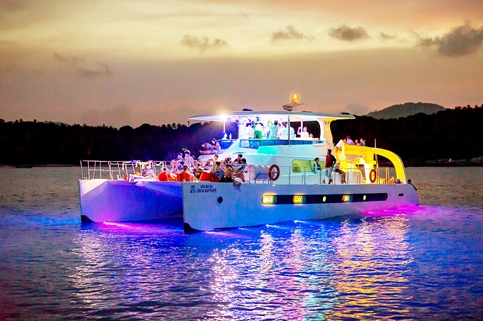 รับประทานอาหารเย็นบนเรือ (มีค่าบริการเพิ่มเติม) พร้อมสนุกสนานกับปาร์ตี้สุดมันส์ ระหว่างล่องเรือกลับสู่ท่าเทียบเรืออ่าวฉลอง