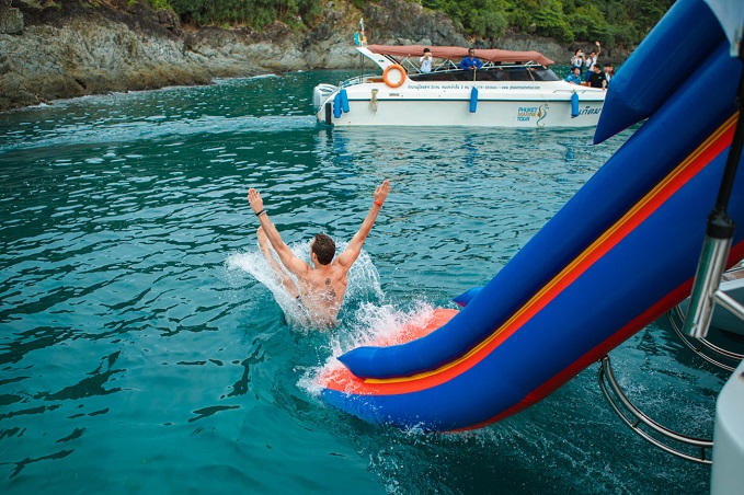 09.00 น. ต้อนรับท่านสู่เรือมอเตอร์ยอร์ช ล่องเรือออกจากท่าเรืออ่าวฉลองสู่เกาะราชาใหญ่ สนุกสนานไปกับสไลด์เดอร์ ดำน้ำตื้นชมความสวยงามของปะการังหลากหลายสี และปลานานาชนิดบริเวณเกาะราชาใหญ่