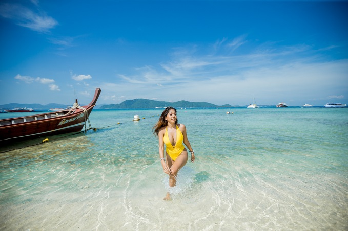 13.00 น. ต้อนรับท่านสู่เรือมอเตอร์ยอร์ช ล่องเรือออกจากท่าเรืออ่าวฉลองสู่กาฮังบีช (เกาะเฮ)